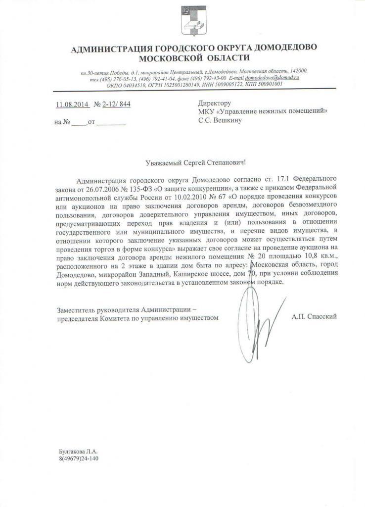 На право заключения договора аренды нежилого помещения, по адресу: Московская обл., г.Домодедово, мкр.Белые Столбы, ул.Пролетарская, д.5