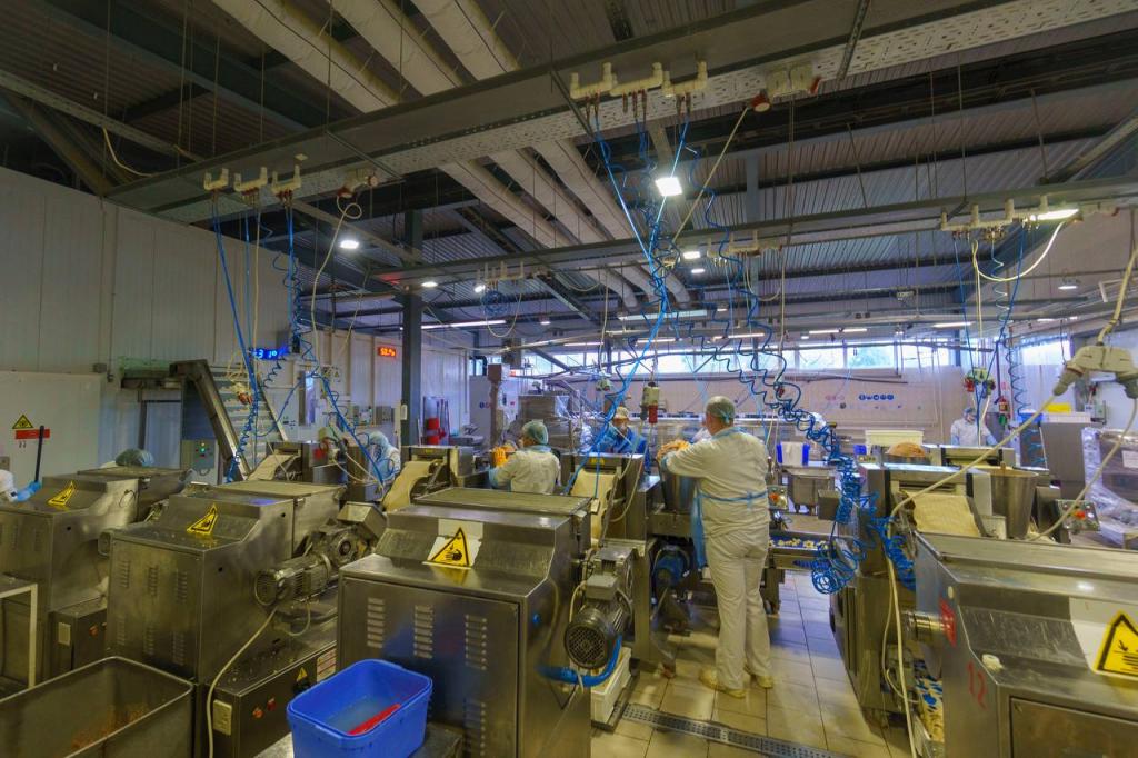 Кроме того, компания развивает производство котлет, наггетсов, колбасы. На предприятии мощное современное производство .. Оборудование завода позволяет обработать более 120 тонн сырья в сутки.